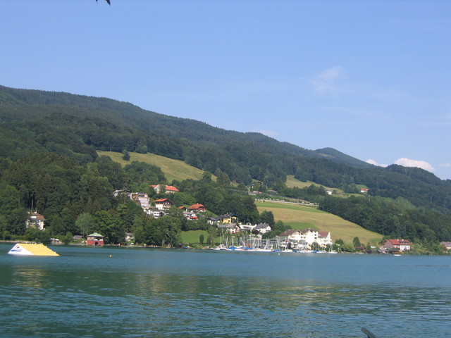 很美又清澈的湖一Mondsee。湖旁邊的小山上,有幾間小屋坐落著,那種景