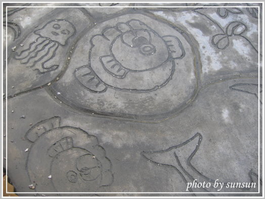 原本死板的水泥地上刻劃出海中生物,很卡通,很可愛。如此別出心裁的設計讓我們不禁莞爾。