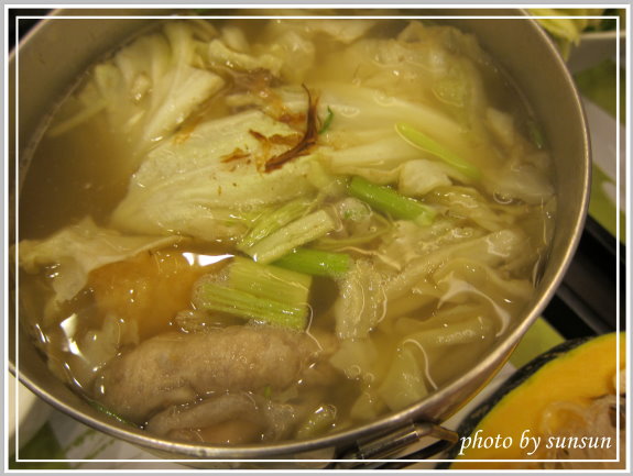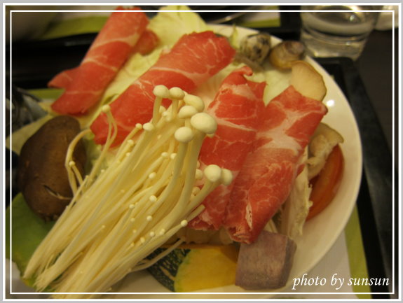 圓盤內有金針菇、南瓜、芋頭、杏鮑菇、香菇、高麗菜、蝦子一尾、蛤蠣以及五六片豬肉片,東西實在不少。