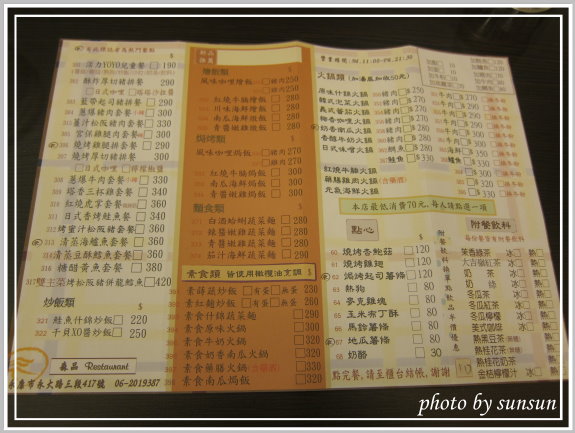 森品的餐點選擇算是頗多樣化,凡舉排餐、中式套餐、焗烤、燴飯、麵食、炒飯、點心、火鍋皆有,茹素者來此也不用擔心,他們也有提供素食餐。