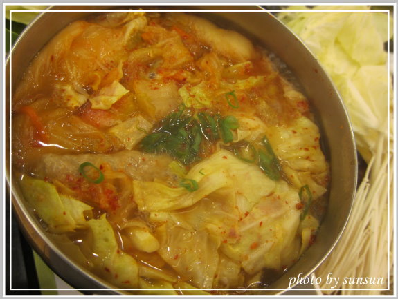 靜芬的豬肉韓式泡菜鍋(270元)有滿滿的泡菜,喝了幾口,滋味果真又酸又辣又香,非常過癮。