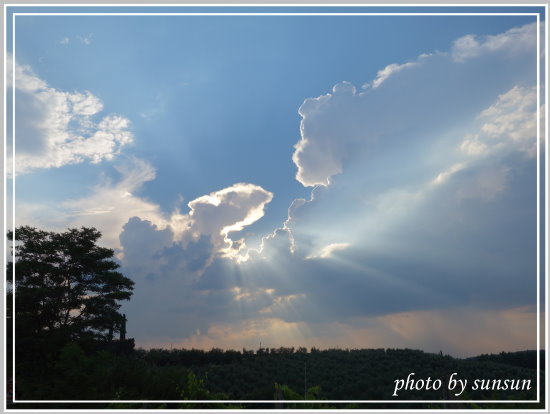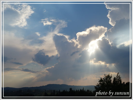 前往聖吉米納諾(SanGimignano)途中,是一片無止盡的田野景致,少不了翠綠的橄欖園、立於山丘上的小巧農舍,即使漫無目的得開,也是一種享受。一處雲層裂開一道縫,午後陽光從中射出,雲層邊緣透著光亮,一道道光束清晰可見,這就是外國人所稱道的耶穌光吧,連我這駕駛也移不開視線,乾脆停下車拍個過癮!