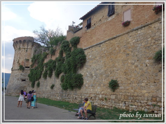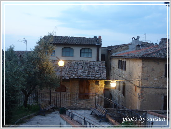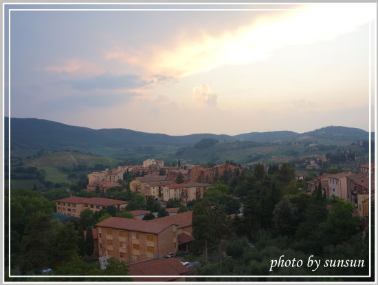 走出另一側城門,過了馬路,可以欣賞典型的托斯卡尼丘陵景色。此時夕陽西斜,透著霞光,相當美麗。