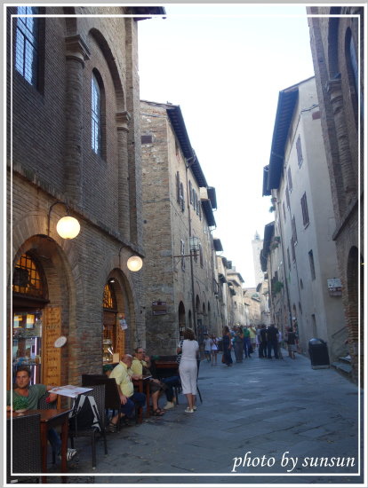 踏入這城區不大的小鎮,彷彿來到縮小版的西耶納,建築的基本色調類似,但西耶納沒有一座座的高塔,遊客也沒那麼多,更令人能敞開心胸徜徉其中;循著石板路前進,我身在中古世紀的小城,真想走入這些百年民宅瞧瞧,一幢幢石磚建造而成的屋子有多久歷史了呢?馬匹馳騁在城中又是何等瀟灑?這些古城鎮總能引思古幽情!