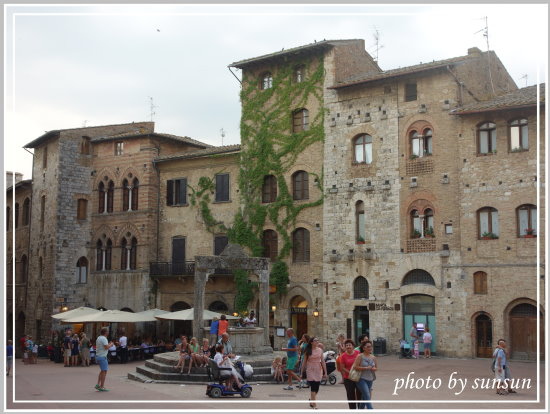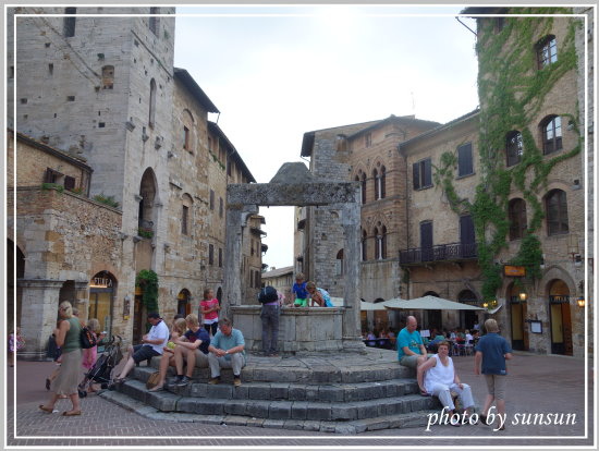大啖完冰淇淋,心滿意足地打量這水井廣場以及周邊的景致(也太貪吃了,哈哈)。水井廣場顧名思義中央有一口古井,遊客坐在石階上享受著傍晚的沁涼微風,看著這一幕,我就像是掉入時光隧道中,心中浮現古時準備打水的女人們閒話家常與小孩在一旁嬉遊的溫馨和樂畫面。聖吉米納諾就是能給我如此宜人舒服的感受!