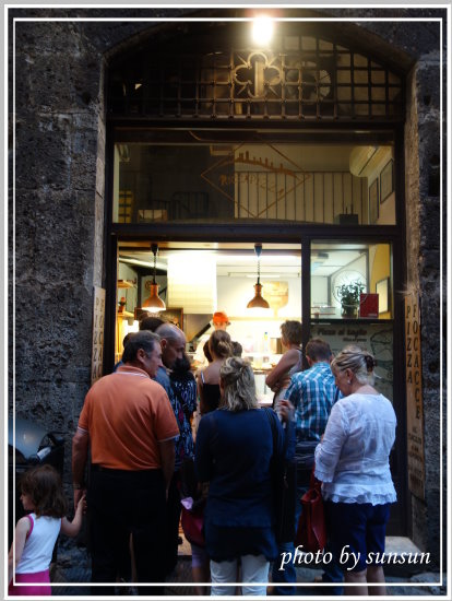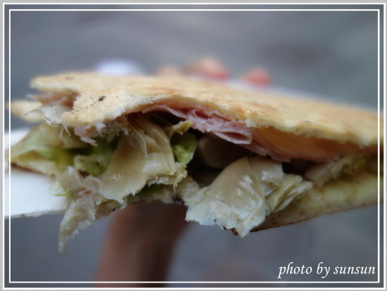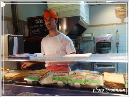 我選了一片3€的delicata,查了翻譯竟然是「嬌嫩」的意思,到底是哪裡嬌嫩,讓我來一嚐究竟。切成三角形的薄餅,外邊餅皮烤得相當酥脆且透著麥子香,內餡有火腿、沙拉、還有吃起來超像竹筍的蔬菜,後來才知道那是朝鮮薊,搭配起來很好吃唷,若不是礙於旅費捉襟見肘,還真想試試其他口味!