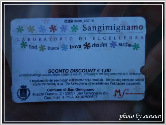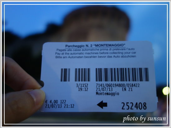 距停好車已近兩小時,小妹拿著票卡飛奔前往停車場投幣打卡,不得不稱讚這位體育健將,就這麼嘟嘟好,19:12分停車取卡,21:12插卡投幣,太神了!聖吉米納諾的停車卡很可愛唷,有彩色小花的圖案呢!