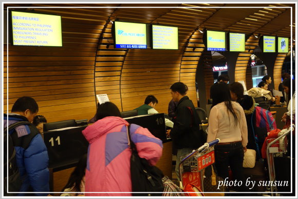菲律賓一向不在我的旅遊計畫中,不過有句名言說得好:「計畫趕不上變化」,拜廉價航空所賜,今年寒假有機會踏上離我們很近的它,並且享受冬天泡在海水裡的暢快,來去巴拉望的公主港與愛尼島跳島避冬囉!搭宿霧航空前往馬尼拉、再轉機到巴拉望,這天剛好寒流來襲,看看大家的行頭就知道威力驚人,不過隔天抵達巴拉望,我們馬上從層層包裹的洋蔥變成不知遮醜的比基尼大嬸,哈哈。