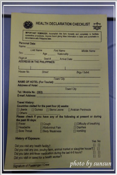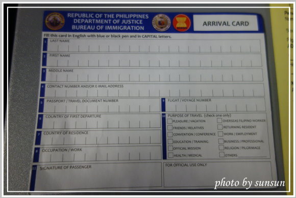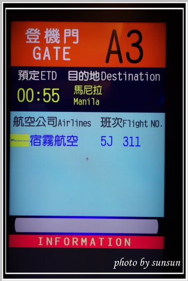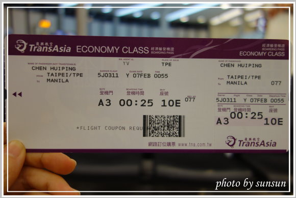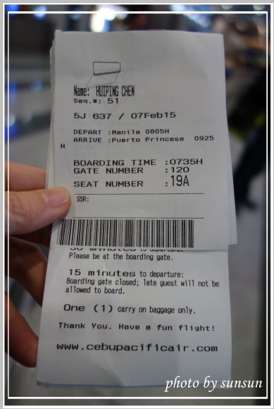 從台灣到馬尼拉飛行時間約2個小時又10分,其實很近。抵達馬尼拉機場必須把行李領出來再次辦理托運,在出關處就有宿霧航空的國內轉機櫃檯,櫃台很小,而且沒告示牌,若不是地勤人員叫住我們,我們根本不曉得那裏可以辦理轉機,印出來的登機證也好環保。