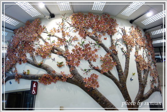 候機室主題是交趾陶與剪粘呈現的阿里山山櫻花,佈滿整片牆面,大器又美麗。
