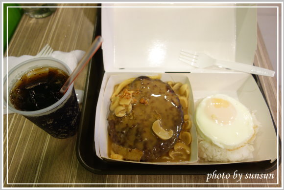 我點了漢堡排套餐,有白飯、荷包蛋、漢堡排與可樂。菲律賓人以米為主食,連速食店都少不了米飯。