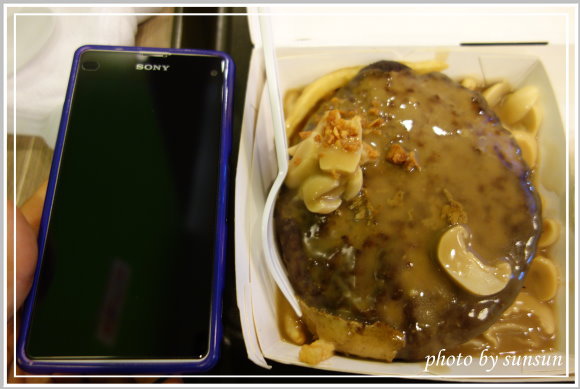 拿sony z1當比例尺,足見這漢堡排的驚人,肉質還可以,醬汁裡有蘑菇,但味道我不太喜歡,肉排下方竟然還有薯條,可惜都冷掉硬了。