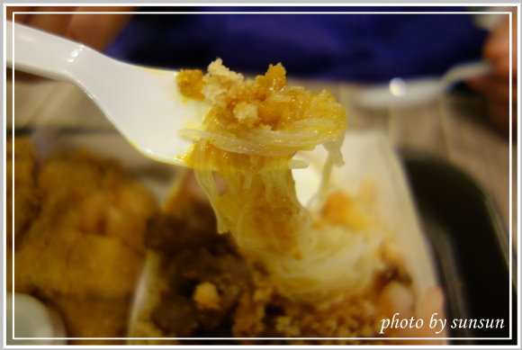 s點了炸雞餐,主食是肉燥米粉,很酷吧。炸雞表面有脆,裏頭雞肉蠻嫩的,米粉與醬汁頗搭,還有一尾小蝦跟兩片水煮蛋,我覺得比我的漢堡排還好吃。