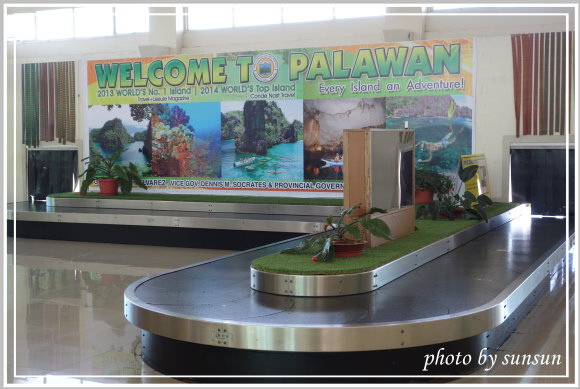 約1個小時又15分後我們抵達巴拉望公主港機場,機場很mini,就一個行李轉盤,而且這個轉盤也很mini,金勾追。