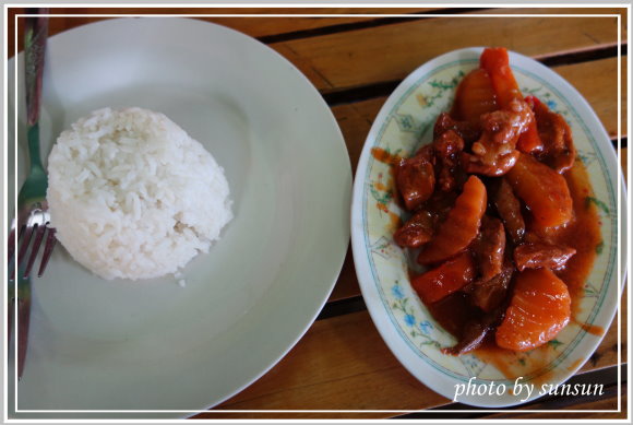 中途會休息,讓乘客上廁所吃午餐。我們兩人的中餐,那麼省?其實是早上剛吃完一大份垃圾食物還飽著,別看這一碗飯一碟豬肉炒紅蘿蔔,也要80p,而味道也是鹹啊。