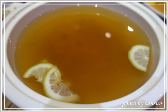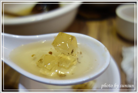 甜點是桂花洋菜凍,看起來沒料,湯匙往下一舀,便可看到附著桂花的洋菜凍,淡淡的花香讓這原本再普通不過的甜湯多了吸引力。