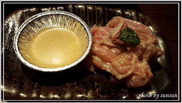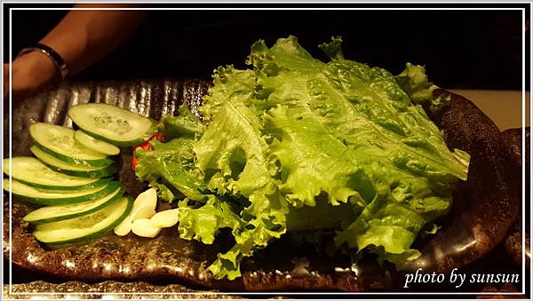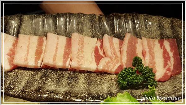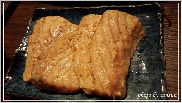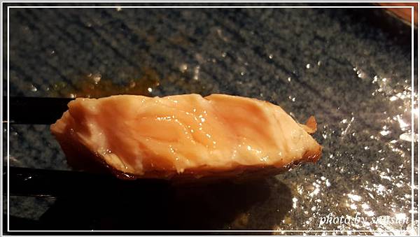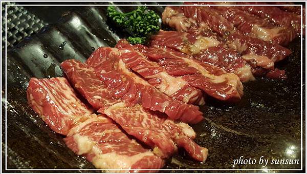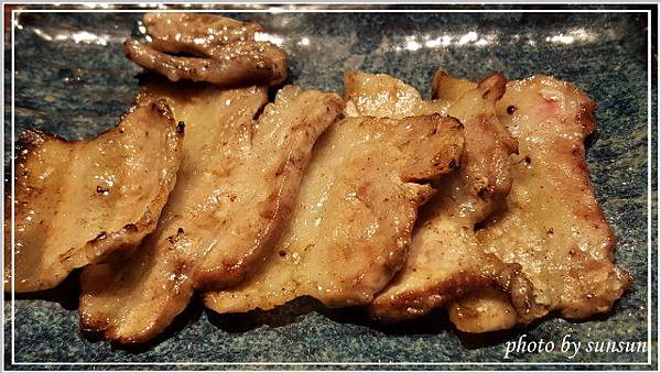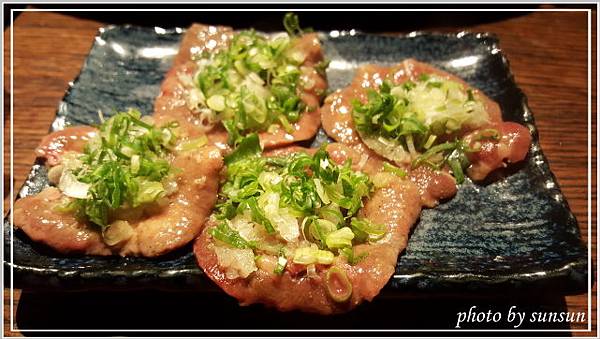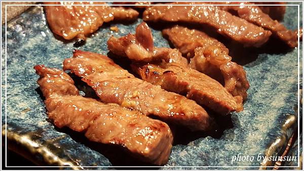 這是已經烤好的蔥鹽牛舌,軟嫩適中的五分熟,上頭放了不少蔥花,不必再沾醬即可食用,覺得鹽多了一些,可能是老了轉性,開始喜歡較清爽的滋味(那還來吃什麼燒肉?)。負責燒烤的專人詢問合不合口味,聽聞我們覺得鹹了點,還說要幫我們重新處理,不過客氣的我們表示不用,再麻煩別人多不好意思啊,呵呵!