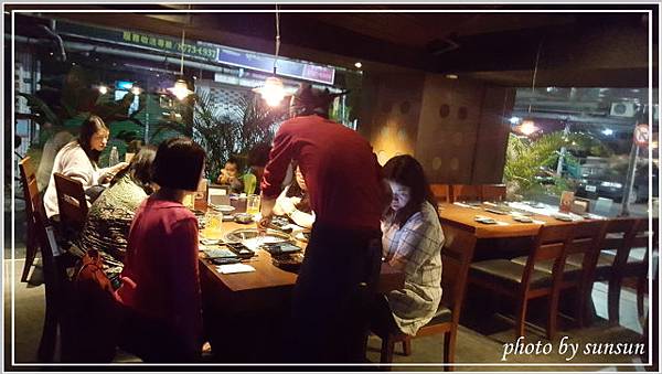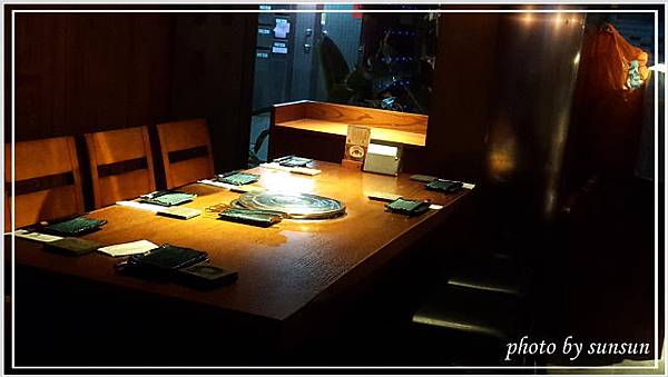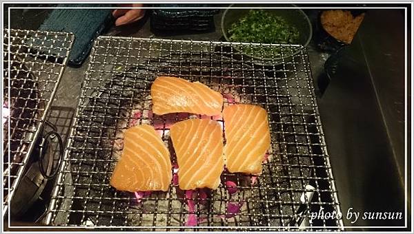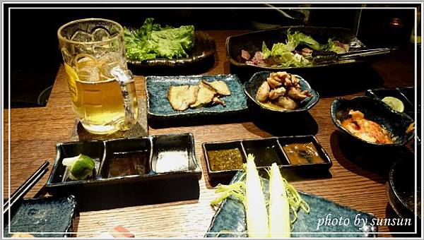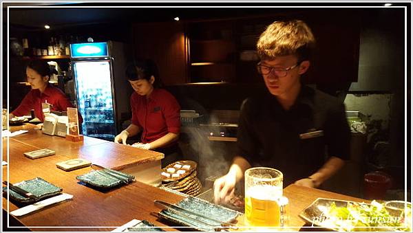 裡面空間沒預期中大,吧台約七八個座位,後方是三四張六人位的木質桌椅,室內黃燈垂吊,打造出沉靜簡約的用餐環境,只是個人偏好明亮點的空間。在這有專人負責燒烤食材,我們只要張開等吃就好,方便又愜意。
