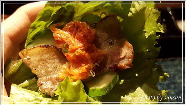 肥滋滋還冒著油的豬五花一定得跟清爽的蔬菜吃才不會膩,生菜鮮度足,包著五花肉、小黃瓜片以及酸辣帶勁的韓式泡菜,大口咬下大大滿足。