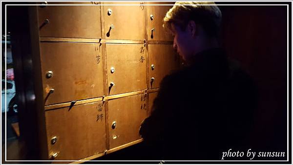 甕也的個人的置物箱,也是令大家眼睛為之一亮的設計,每個箱子有瀟灑毛筆字寫的中藥材名稱,把東西放入後箱子鎖上,鑰匙會交給客人,需要取物時再跟服務人員說,他們會為你服務,這一大片置物箱在放取物時會拉出,之後會推入到一長條型的空間,設計深具巧思。