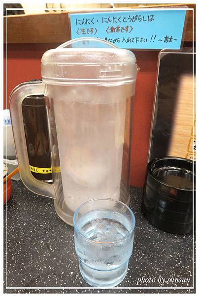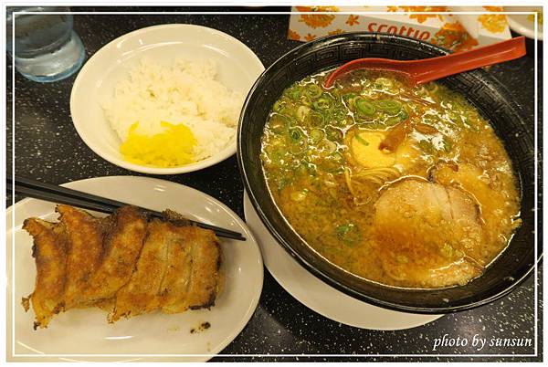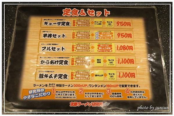 菜單一張兩面,我們點了正面的第一個拉麵(680 ¥),看樣子應該是招牌,以及背面的第一種套餐( 950¥),套餐包括三種拉麵擇一、白飯一碗、煎餃一份,其實點的時候只知道有拉麵,白飯跟煎餃都是送來才知道的,好像在等開獎一樣,哈哈。