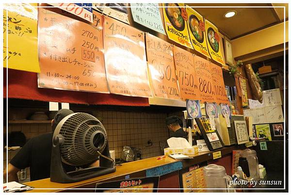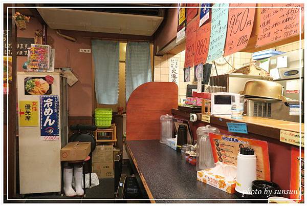 店面不大,有一排吧台座位以及三四組有隔開的包廂座位,裡面除了我們兩個觀光客外,其他看起來都是當地人。吧台上方貼滿了各式菜單,我們也不用研究,撒攏謀啊,不過看圖猜猜看倒也有趣,令人對食物更加充滿期待。