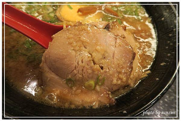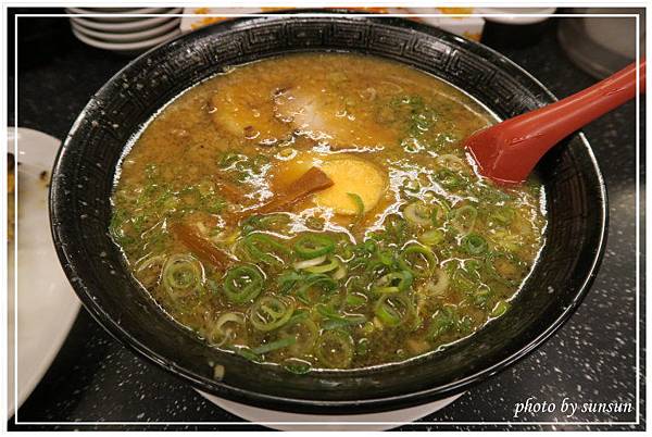 不過我很蠢,套餐的拉麵也沒指定,所以兩碗拉麵湯頭是一樣的。豚骨醬油拉麵看起來份量不少,這湯頭可是它們的招牌呢,湯的顏色不淺,上面浮著背脂,熱量之高可想而知,吃拉麵習慣先喝一口湯,這味道比預期中清爽,而且特製的醬油散發出一股香氣,讓整碗拉麵不會油膩死鹹,為了嘗到那迷人的香味,願意一口接一口地喝湯(當然還是得配白開水啦);半顆蛋是一般的熟蛋,另外還有筍干跟數量不少的蔥,當然少不了叉燒。