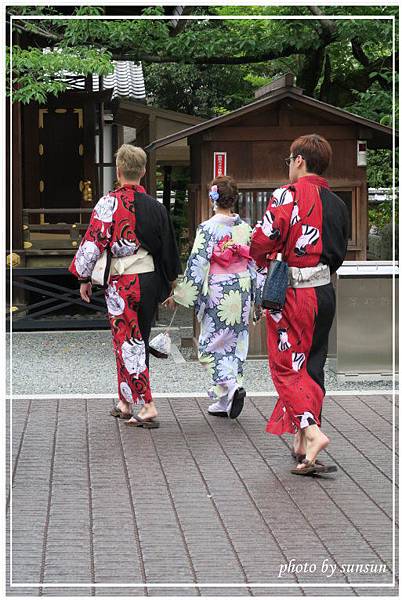 說起日本最吸引遊客之一的應該就是傳統和服或浴衣,每次看到花色美麗的穿著總忍不住拿起相機偷拍,而這兩位男子想來就是要讓人拍的,頭一次見到男性服裝如此顯眼斑斕。
