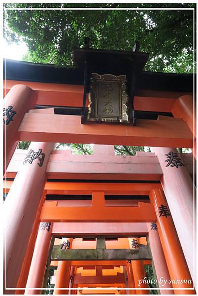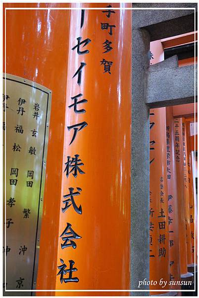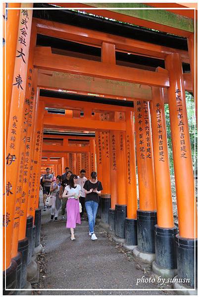 繞到後方來到千本鳥居,看到綿延不絕的朱紅色鳥居一座接一座,另一面刻著公司行號名稱或敬獻者名字,真心感受到信仰的力量是多麼神奇且重要!