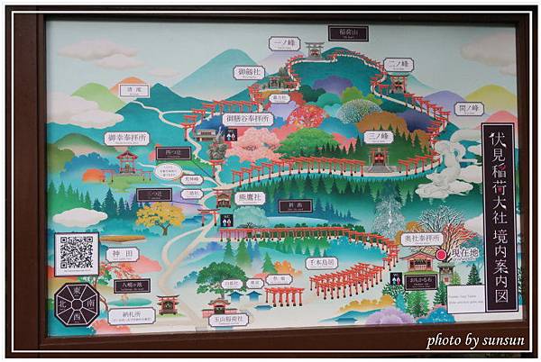 路線告示牌設計得很令人心生嚮往,可一路往上爬到山頂,不過多數遊客大概在三分之一處就會從另一條路回到大社,這次因時間有限,下次有機會想挑戰登頂,順便拍一下無人千本鳥居的風采(這才是目的,哈哈)!