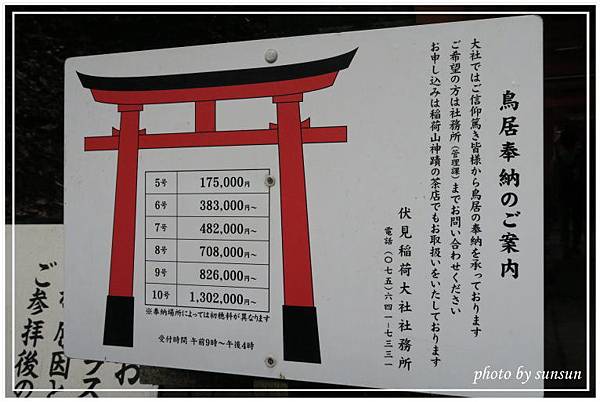 想感謝神明有心奉納鳥居一座,來來來,這有價目表,最便宜的5號,175000¥,發大願要還願者有最壯大的10號可以表達虔誠之心,一座1302000¥。
