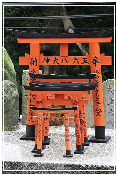 S說「想拍無人的鳥居,這裡就有」,馬上回送一記白眼;這是長長鳥居旁的一個小平台上呈列的小鳥居,另外也有豎立上有刻字的石塊供人參拜。不過這些小小鳥居還真是股追!