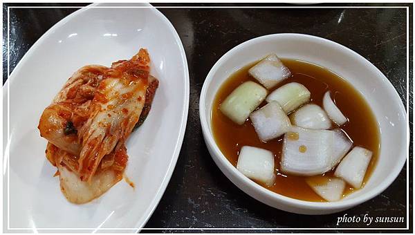 可免費續加的小菜,幾天下來各家餐館的泡菜都各有不同滋味,酸度辣度也不盡相同,每次都讓我充滿期待。盞綵家的泡菜爽脆可口,醃洋蔥也開胃,很不錯。