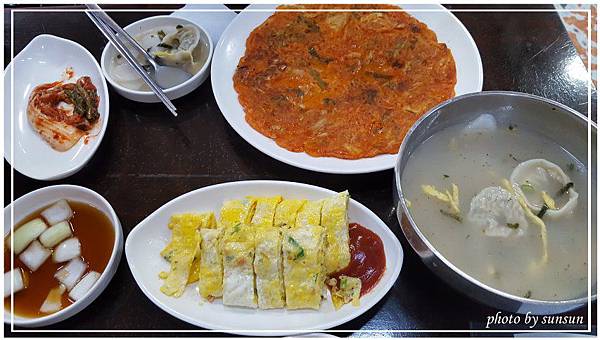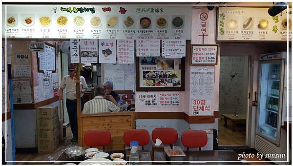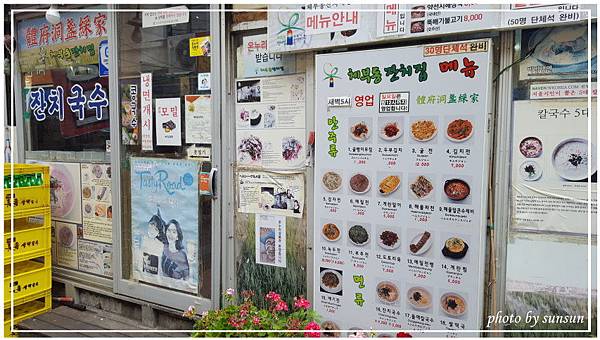 從景福宮出來還了韓服,兩人肚子已是拼命敲鼓狀態,從早上吃完早餐、在景福宮內的餐廳喝了一杯柚子茶後沒再進食過,只能說女人穿起漂亮衣服就以為是世界焦點、失心瘋狂拍,完全忘了「身體重要」這個真諦啊。搜尋一下在景福宮第鐵站二號出口附近有條在地美食街,裡頭有不少備受推薦的好店,鎖定這間「體府洞盞綵家」,快步前進!店外貼滿了廣告跟菜單,從外觀看真的是很樸實的ㄧ家餐館。