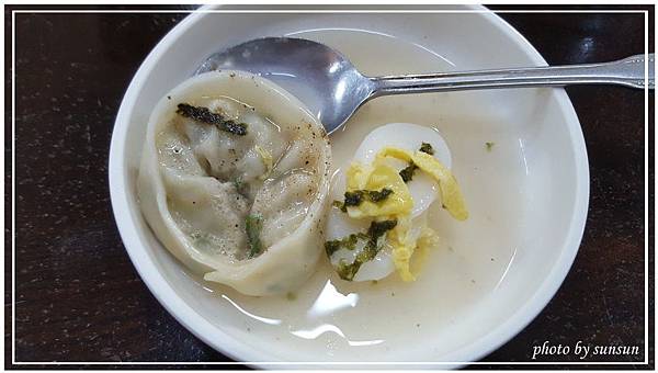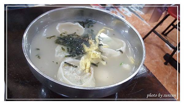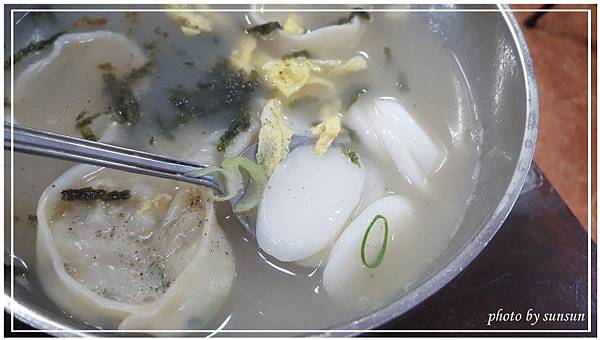 餃子年糕湯5000w,至少四顆的圓形餃子,內餡飽滿,豬肉蔬菜餡處理得很細,吃起來有點「泥」的口感;一片片白色彈牙的年糕吸飽了湯汁更為好吃,上面灑有蛋絲與海苔,讓滋味更多元豐富!
