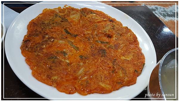 泡菜煎餅7000w,紅通通薄片的煎餅外皮很酥,裡頭的泡菜給的不少,吃起來酸酸辣辣又香酥,很好吃,令人難忘。