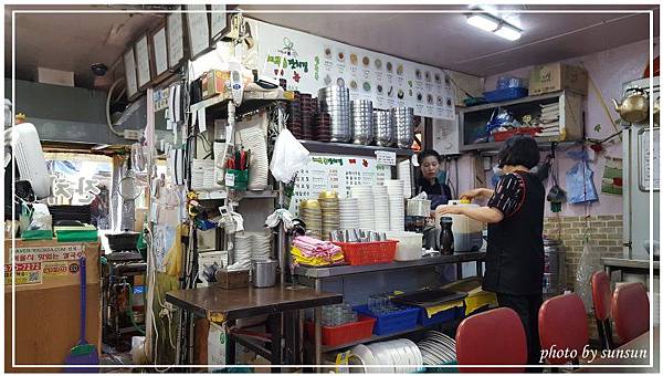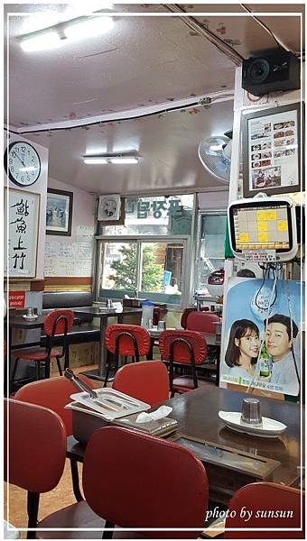 室內有廚房,還有疊得很高、各式各樣的碗,看不懂意思的成語書法,還有笑得很豪邁的韓國大嬸。