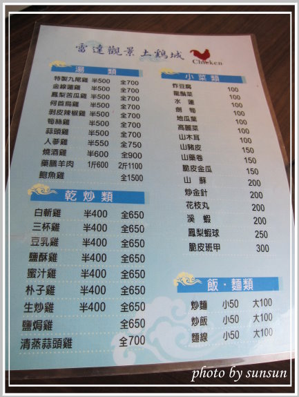 既然是土雞城,主要料理就是土雞,光雞肉的菜色就有19道,讓人不曉得挑什麼好,另外青菜類溪蝦炒飯炒麵這類熱炒也都有提供。