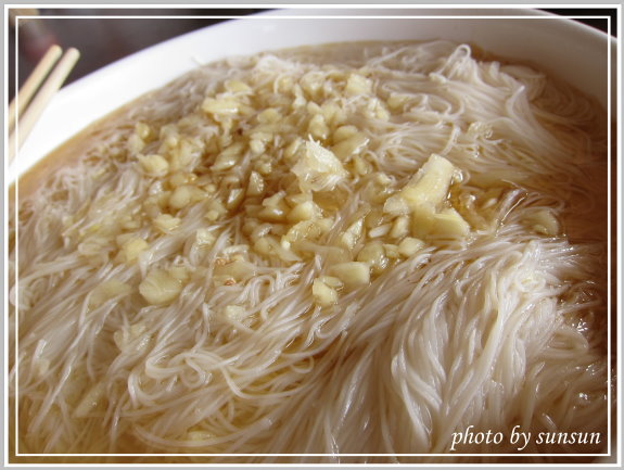 端上桌時其實讓人有點傻眼,麵線蒜頭以及麻油湯汁,樸實的有點過分阿,呵呵!夾了一口送進嘴裡,吸滿麻油的麵線有彈性,拌點蒜頭味道更香,簡單料理卻出乎意料的好吃。