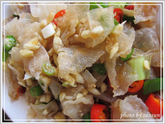 口感薄又脆,淋上蒜辣椒青蔥調成的醬汁,酸酸辣辣超開胃。